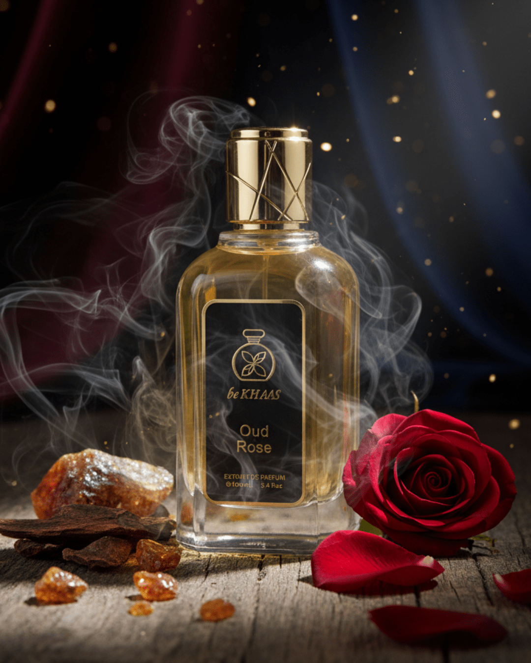 Luxury fusion of rich rose and warm oud, inspired by the golden dunes at sunrise. Opulent, velvety, and timelessly elegant.
